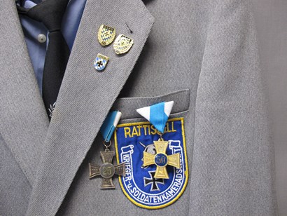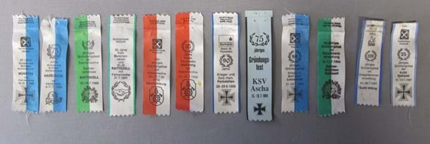 Gesammelte und sorgfältig aufbewahrte Festbändchen und Ehrenabzeichen eines Mitglieds der Krieger- und Soldaten |
