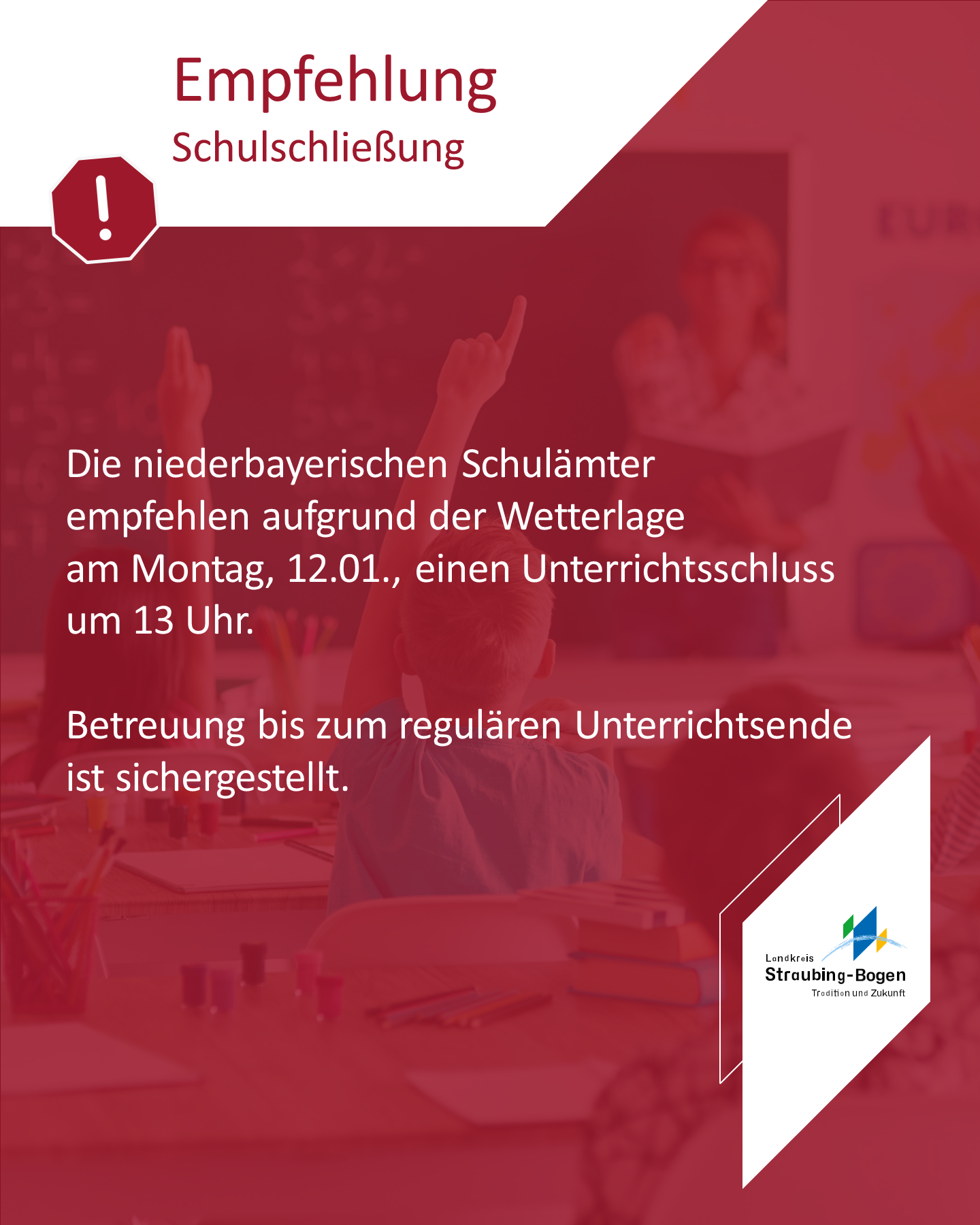 Als heutigen Unterrichtsschluss wird 13 Uhr empfohlen. Die Empfehlung übernehmen alle niederbayerischen Schulamtsbezirke in gleicher Art und Weise.