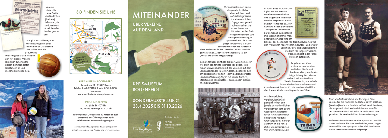 Heuer ist zusätzlich eine neue Sonderausstellung zu sehen: „Miteinander. Über Vereine auf dem Land“. Die Ausstellung befasst sich mit der Geschichte und Gegenwart ehrenamtlichen Engagements auf dem Land am exemplarischen Beispiel von Vereinen des Landkreises Straubing-Bogen. Historische Fotos, Objekte und Schriftstücke erzählen von der Ausbreitung und dem Leben der Vereine auf dem Land seit etwa Mitte des 19. Jahrhunderts. 67 Interviews mit Personen aus der Region beleuchten die heutige Situation. Dazu kommen Hör- und Fernsehstationen, Fotoalben zum Blättern, Literatur zum Nachlesen und vieles mehr. Geeignet ist die Ausstellung für Groß und Klein, Führungen können jederzeit gebucht werden.